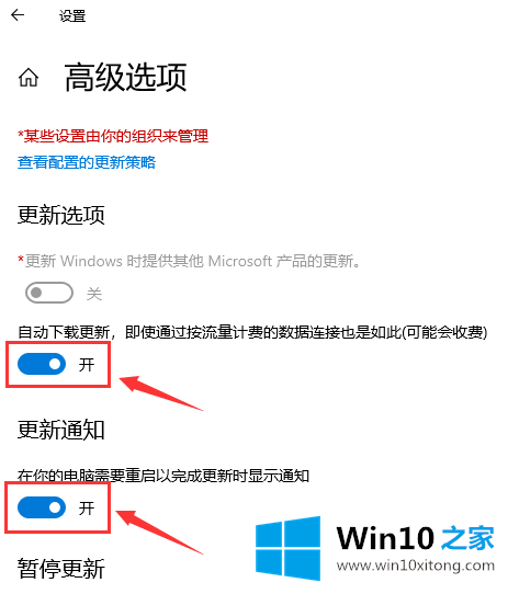 4、在高级选项页面,关闭自动更新的按钮,关闭更新通知的按钮,如图所示。