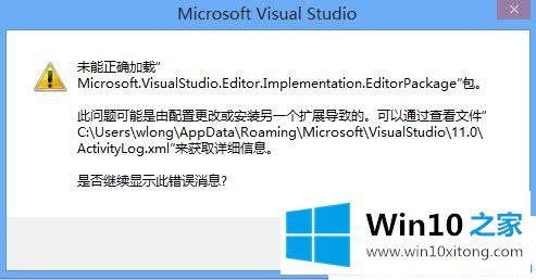 第一步:在win10中打开VS2012弹出以下错误提示框:未能正确加载,此问题可能是由配置更改或安装另一个扩展导致的。这应该就是缺少某个或是某些压缩包引起的。