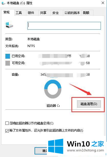 第三步:打开win1064的系统盘属性界面,切换到常规项,点击下方的【磁盘清理】。