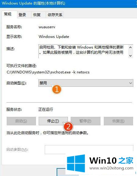 第五步:我们将"启动类型"设置为"禁用"服务状态改为停止,最后点击确定按钮。再次点击更新按钮就可以正常更新Win10了。