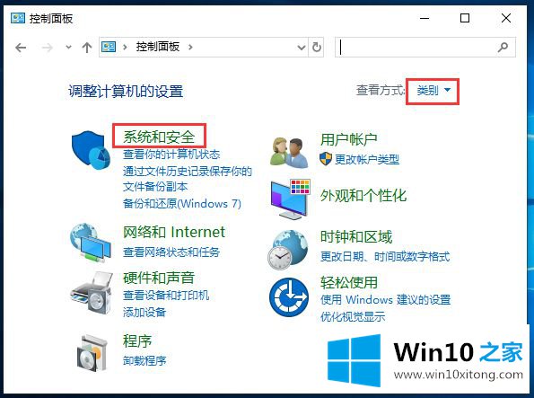 第二步:选择类别查看方式,点击进入"系统和安全";