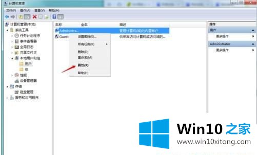 第六步:在右方用户列表中,右键点击【administrator】选择属性选项;