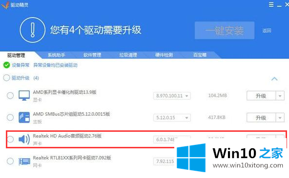 2.检测完成后,会显示设备已经挂起,需要安装声卡驱动。然后,我们单击安装声卡驱动程序,等待修复完成。
