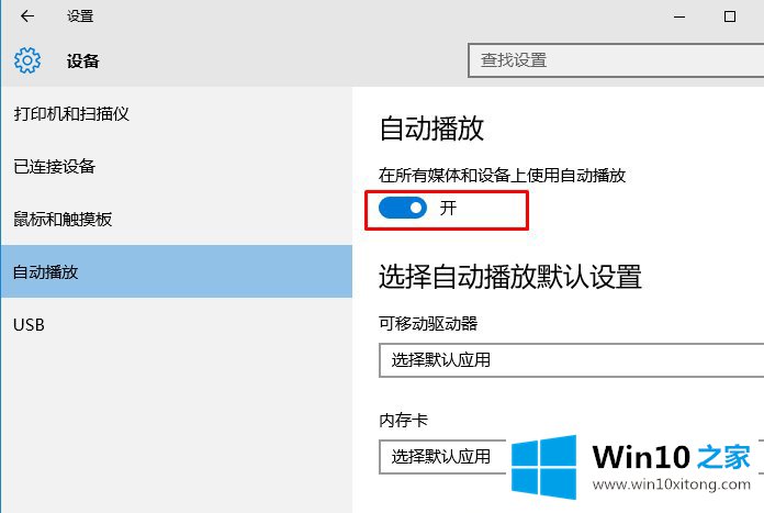 3.在设备设置页面,选择“自动播放选项”,将“在所有媒体和设备上使用自动播放”设置为“打开”,如图所示。