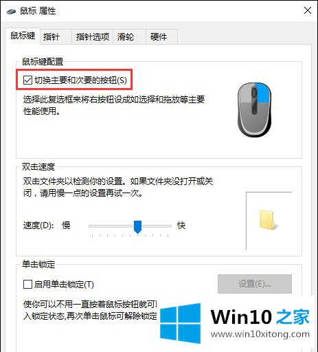 3.在鼠标属性设置的按钮设置中勾选“主次按钮切换”,然后点击确定。
