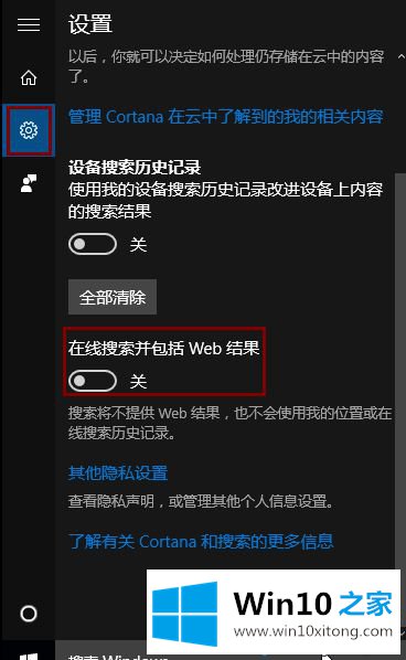 单击任务栏中的Cortana搜索框,在弹出窗口中单击“设置”,然后关闭“在线搜索并包含web结果”,如图: