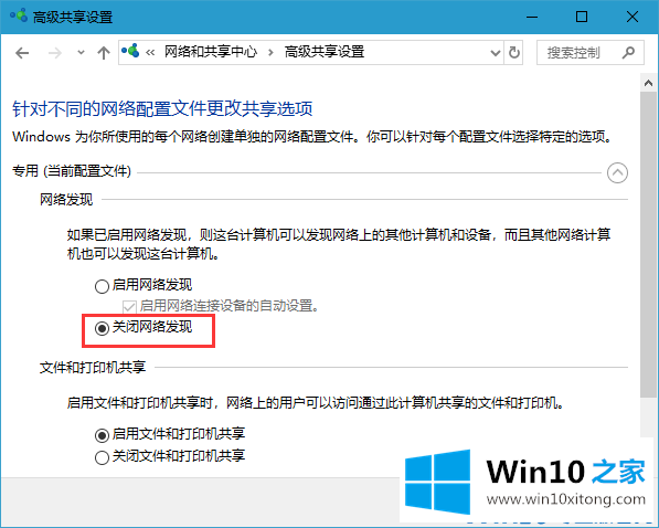 3.单击您自己的网络类型,在“网络发现”项目下找到并选择“关闭网络发现”,然后单击底部的“保存并修改”!如图所示: