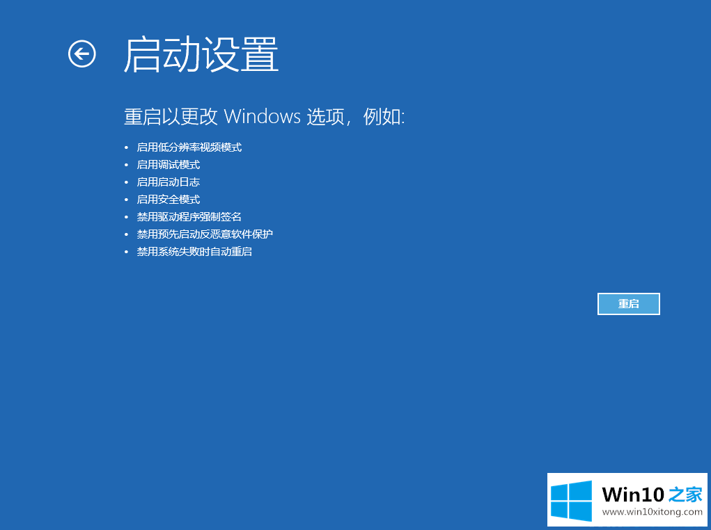 5.在启动设置选项中,我们直接选择重启。