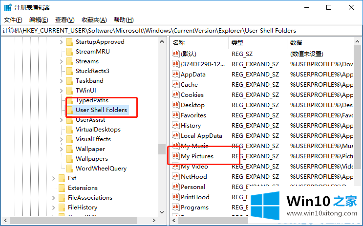 2.在注册表编辑器中,按照“HKEY _当前-用户\软件\微软\窗口\当前版本\浏览器\用户外壳文件夹”的路径展开,然后双击窗口右侧打开“我的图片”
