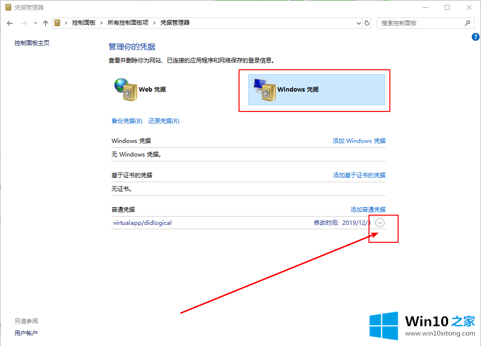 3.进入凭证管理器页面后,找到Windows凭证’,如图展开;