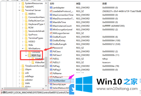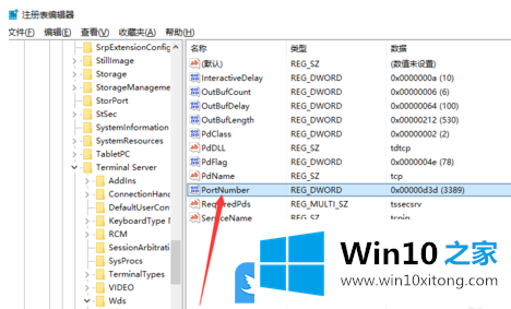 4、注册表编辑器窗口中,依次展开到:HKEY_LOCAL_MACHINE\System\CurrentControlSet\Control\TerminalServer\Wds\Repwd\Tds\Tcp然后在注册表编辑器窗口中,找到PortNamber项,更改为要使用的远程端口,例如10000即可