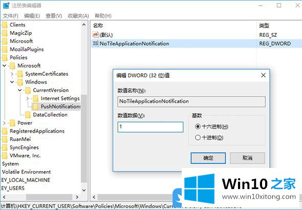 4、接着点击 PushNotifications ,在右侧新建DWORD(32位)值,并且命名为 NoTileApplicationNotification ,双击后把数值数据改为1;