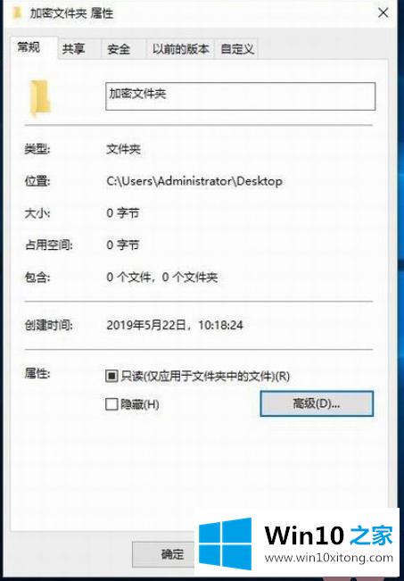 2.在加密文件夹属性窗口中,选择常规选项卡下的高级