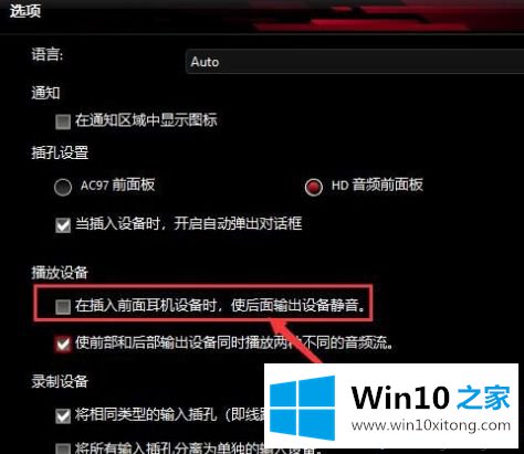 5.取消勾选“插入前置耳机设备时将后置输出设备静音”,点击“确定”,解决没有扬声器或耳机插入的问题。