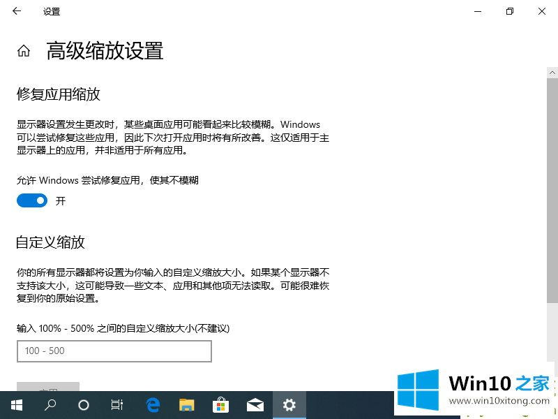 3.然后打开“高级缩放设置”和“允许窗口尝试修复应用程序,使其不模糊”,在下方输入框中输入您在上方选择框中看到的数字,然后单击“应用”。