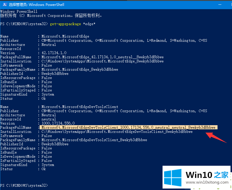 4.然后在microsoft edge包下找到packagefullname包名,如图所示。用鼠标选择并复制。