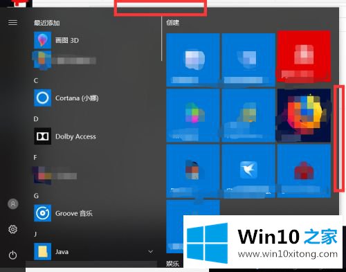 6.我们可以通过将鼠标放在开始菜单的边缘来调整开始菜单的大小,如图所示,并将其调整到如图所示的大小,就像windows7开始菜单一样。另外,我们常用的一些应用也可以用在开始菜单的平铺上,可以让我们的桌面整洁。固定图块时,在开始菜单的应用列表中点击鼠标右键,选择固定;