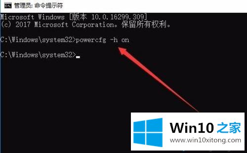 3.在打开的命令提示符窗口中,输入命令powercfg -h on,然后按回车键。