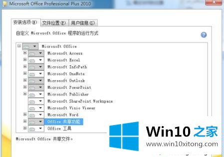 4.选择自定义安装-办公室共享功能-设置“业务连接服务”为不可用,如图所示-下一步。