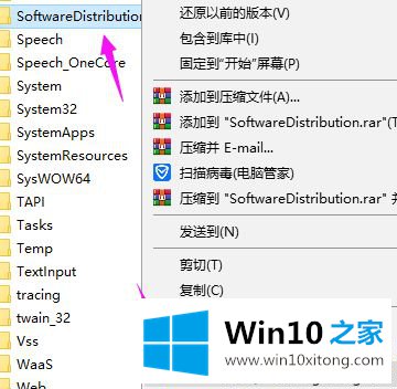 8、找到【C:\Windows\SoftwareDistribution】,单击它, 选择【重命名】,如图。
