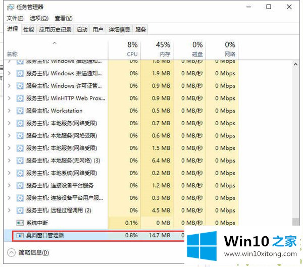 2.将出现任务管理器。在该过程中,找到桌面窗口管理器,然后单击结束过程。
