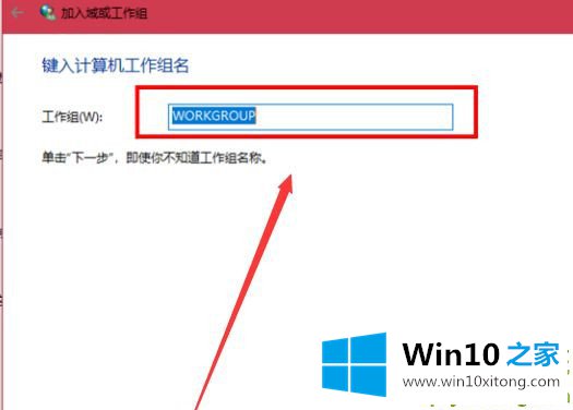 10.输入工作组的名称,默认为[工作组]。要共享的计算机必须确保工作组名称一致。