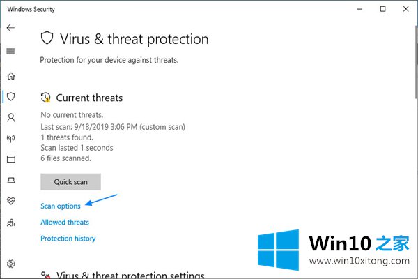 3.当病毒和威胁防护屏幕打开时,单击扫描选项链接;