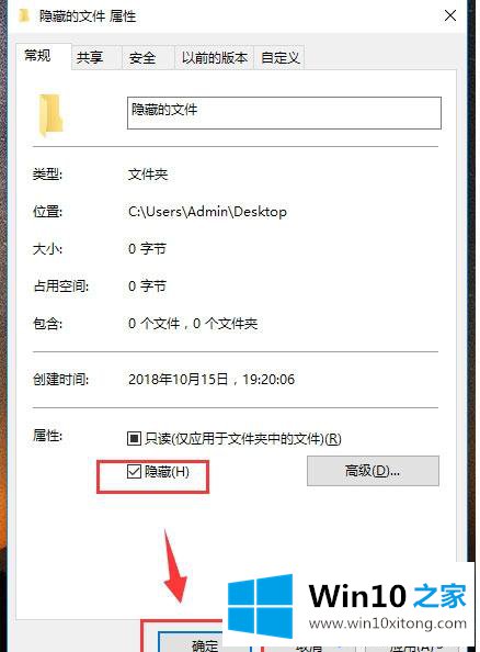 3.在出现的属性界面,找到隐藏选项,勾选后点击确定;