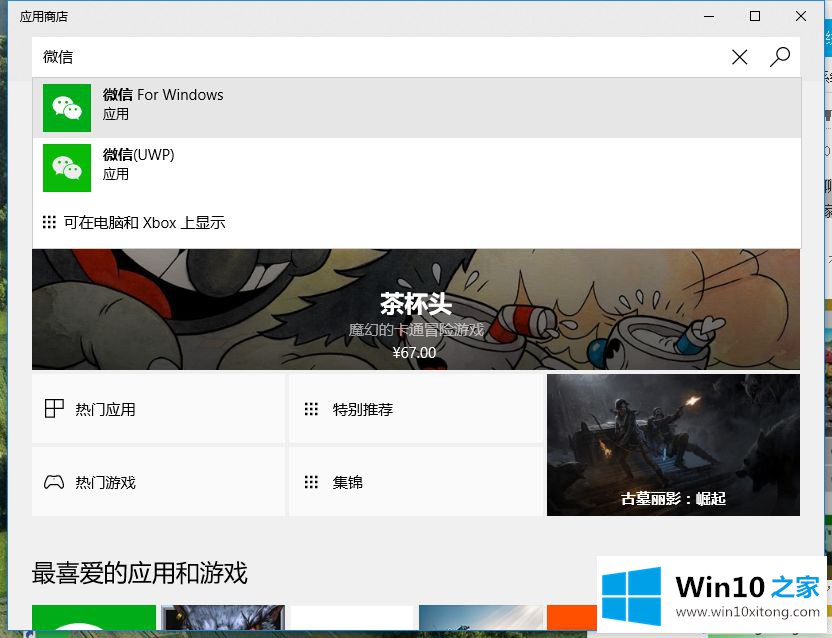 2、在窗口的上方点击搜索图标,在搜索框中输入“微信”,搜索框下方的建议结果中,将会出现“微信 for Windows 10”。