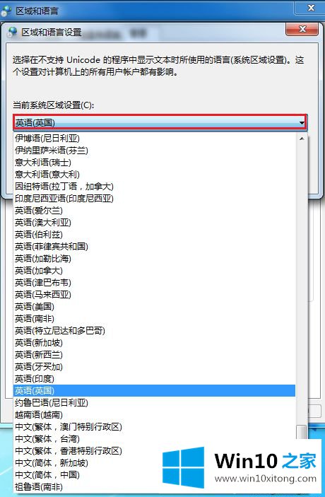 8、在区域设置的选择框中,我们先把区域更换为“英国”,保存后重启电脑。