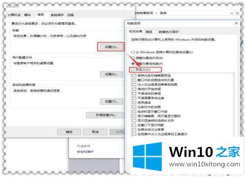 然后请在“性能”处点击“设置”功能按钮,在弹出的复选对话框中,将一些不必要的应用效果取消掉。如下图所示: