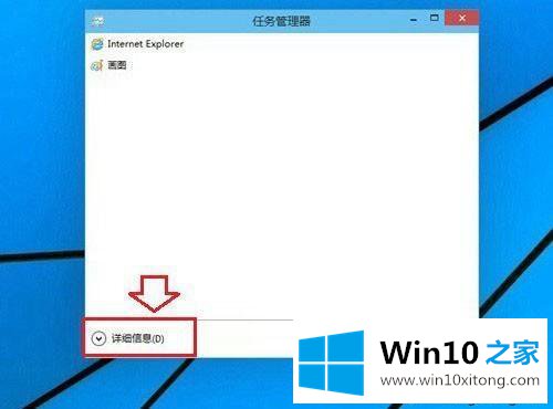2、大家可以点击底部的“详细信息”就可以显示出完整的Win10任务管理器界面了;