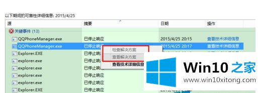 6、在这些错误事件中,找到与explorer.exe位置最接近的错误事件(在下图中是蓝色框标出的部分,即QQPhoneManager.exe错误事件);