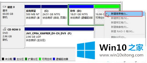 4、接着删除后,可以看到原来的磁盘变成了绿色的磁盘,直接右击选择“新建简单卷”。