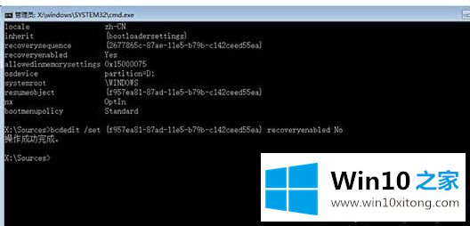 ▲接着输入bcdedit /set {GUID} recoveryenabled No回车运行,运行该命令后就会暂时禁用系统的自动启动修复功能。其中的{GUID}即为上一步中记录的字符;