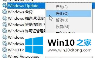 3、在服务界面找到 Windows Update 服务,单击右键,选择【停止】;