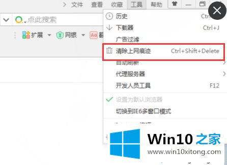 1、打开浏览器右上方的“工具”,选择“清除上网痕迹”;