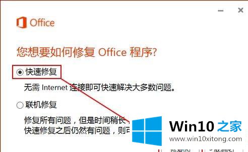 3、 这里会有快速修复和联机修复两种修复方式(如果在快速修复之后仍然有问题,则可以选择此修复。可根据情况自行选择);