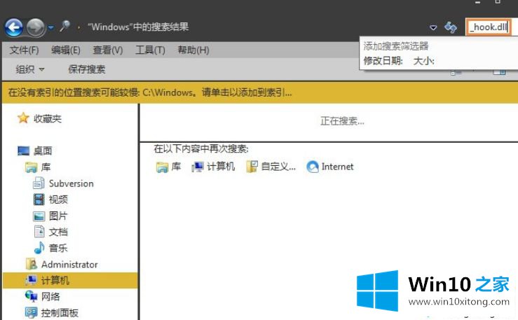 2、打开Windows的“搜索文件”,文件名称输入“_hook.dll”,搜索位置选择Windows的安装目录(默认Win98/WinXP/Win7为C:\Windows、Win2000/WinNT为C:\Winnt)。