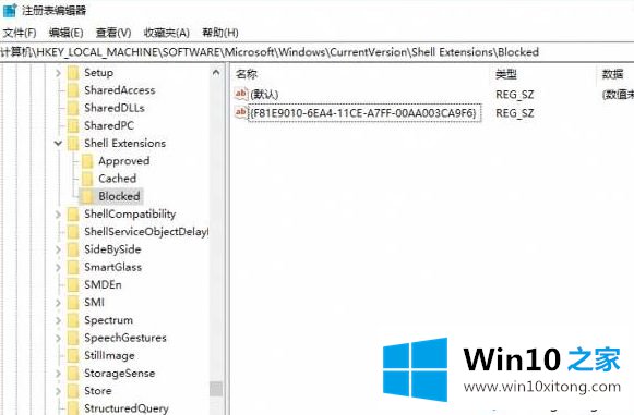 4、进入进入到\HKEY_LOCAL_MACHINE\SOFTWARE\Microsoft\Windows\CurrentVersion\Shell Extensions\Blocked