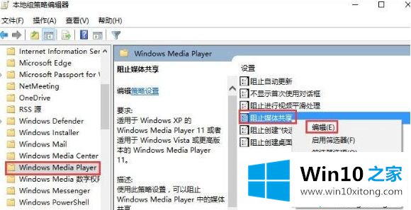 3、在“Windows Media Player”选项右侧窗格中找到“阻止媒体共享”,右键点击“阻止媒体共享”打开“编辑”选项命令;