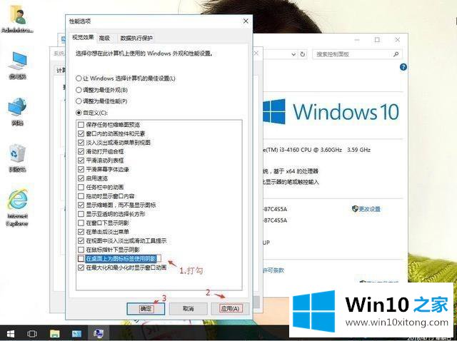 4、在视觉效果选项,把在桌面上为图标标签使用阴影打勾。再应用,确定;