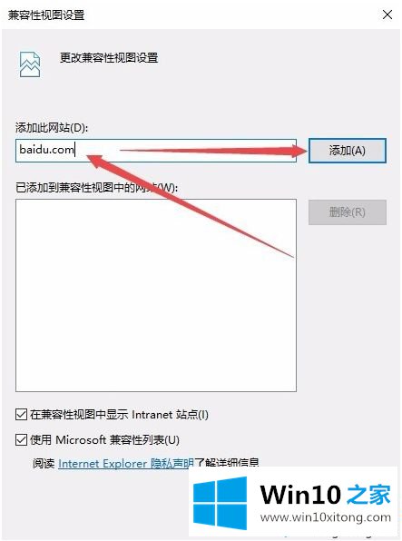 3、在打开的兼容性视图修改窗口中,输入要降低版本的网址,接下来单击右侧的“增添”按下钮。