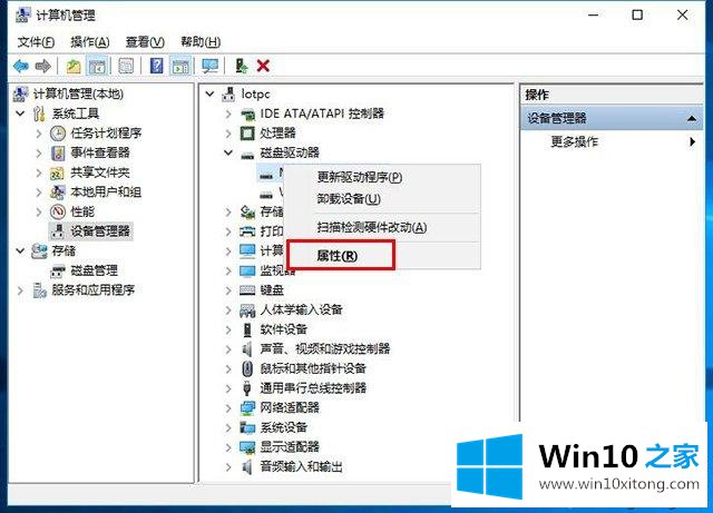 2、单击左侧栏中的“设备统制器”,在右侧栏中点击磁盘驱动器,在固态硬盘上右边的键一起单击属性。