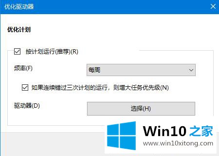 7、这时会弹出优化驱动器窗口,在这里选中“按计划运行”前的复选框,然后在频率一项设置自动优化的周期,接下来点击“选择”按钮,在窗口中选中要自动优化的盘符,最后点击确定按钮;