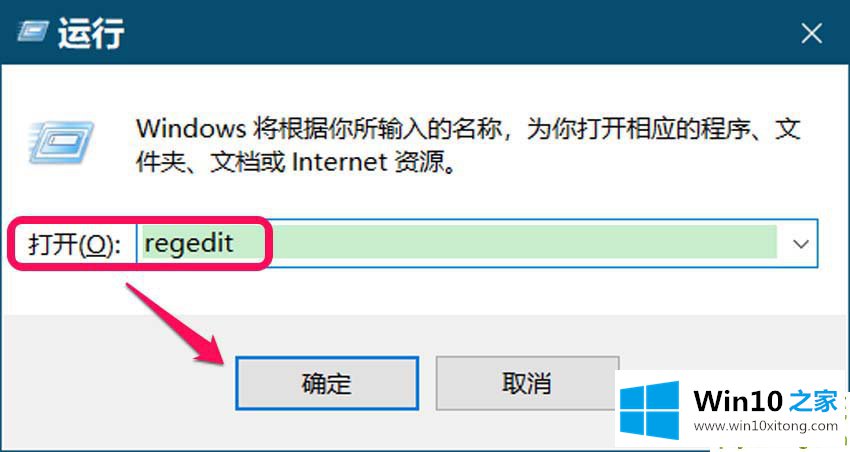 1、在【运行】对话框中输入:regedit,点击确定或按下键盘上的回车键,打开系统注册表编辑器;