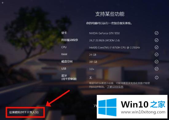 5、接下来会自动检测您的电脑配置,配置不符合要求的自然不能打开了,在下的配置勉勉强强刚够用。点击左下角的设置模拟(不要点下一步,除非你连接了头戴显示器)
