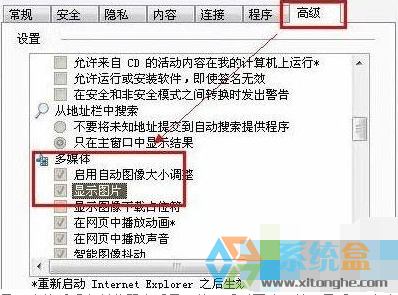 1、进入浏览器的nternet 选项,之后点击其中的高级展开多媒体, 勾选显示图片即可