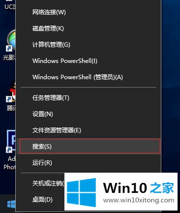 1、在电脑左下角点击右键,在弹出的选项卡里面找到搜索;