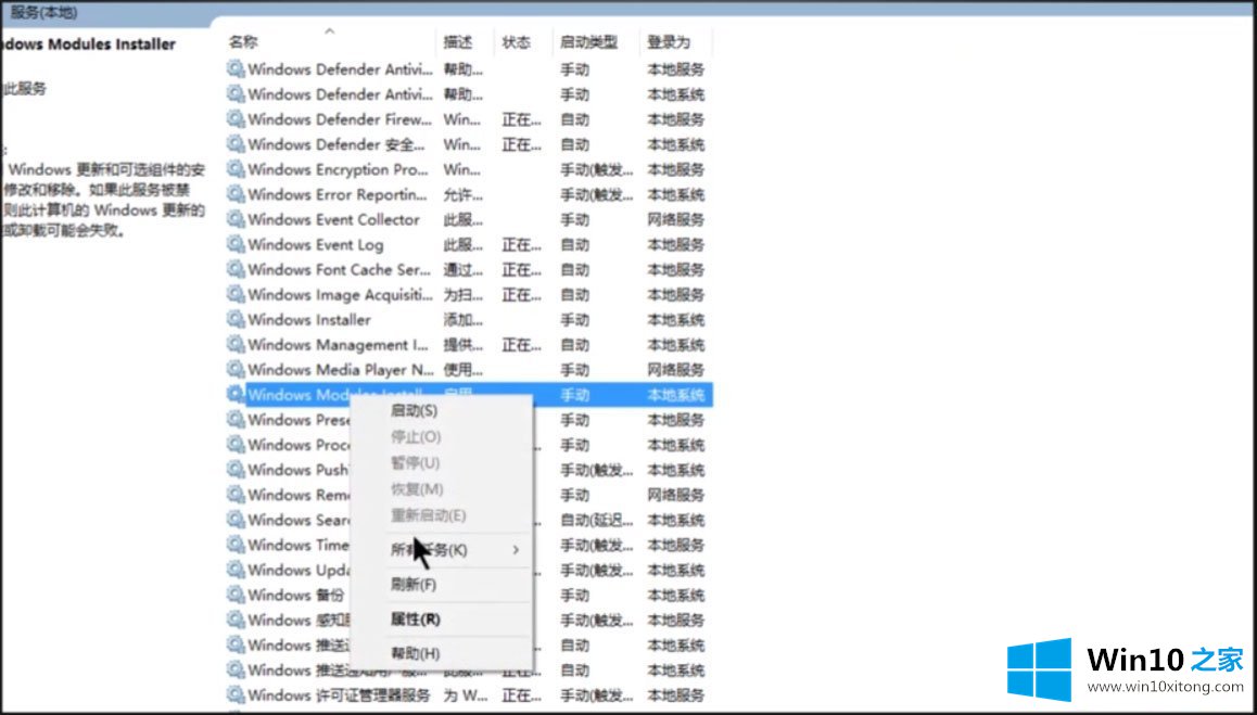 2、下拉找到"Windows Modules Installer"服务,右键点击,选择"属性";
